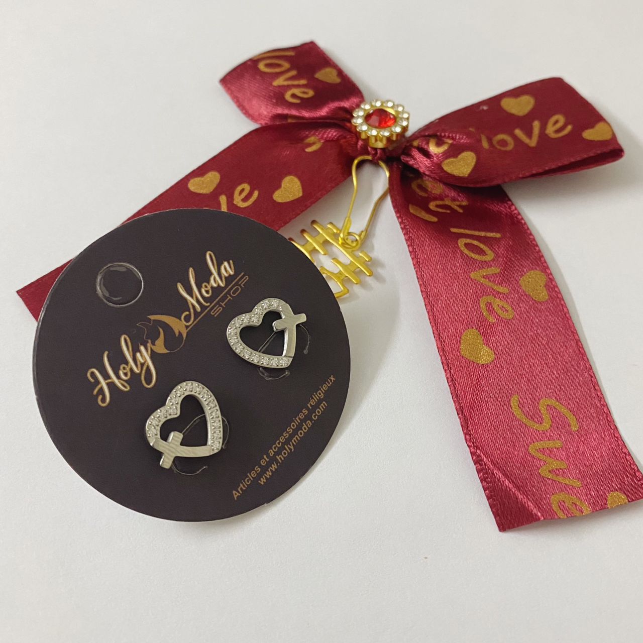 BOUCLE D’OREILLE CROIX AVEC COEUR ET PIERRE ( strass blanche)