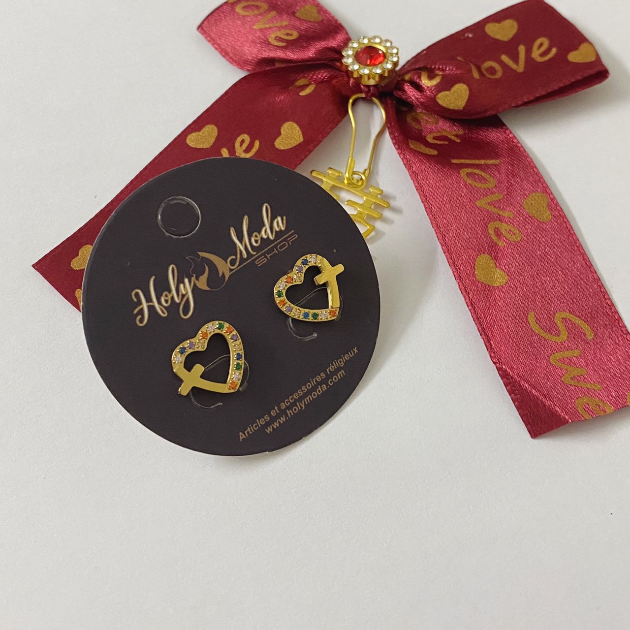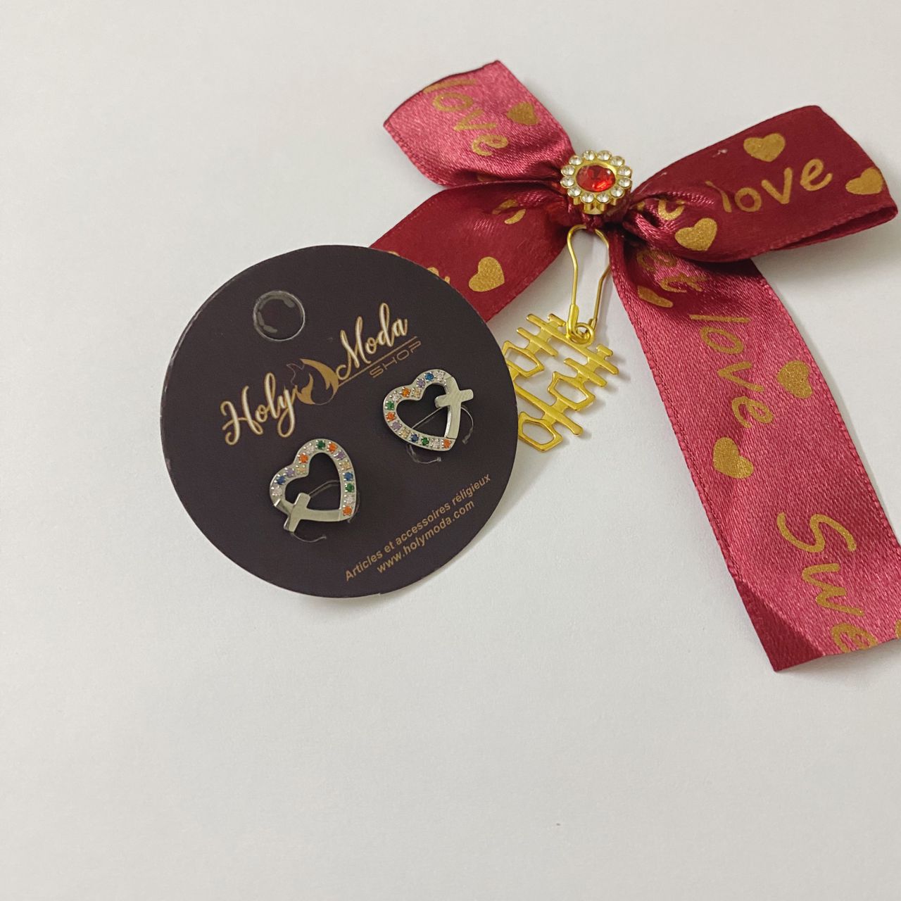 BOUCLES D’OREILLE CROIX AVEC COEUR ET PIERRE