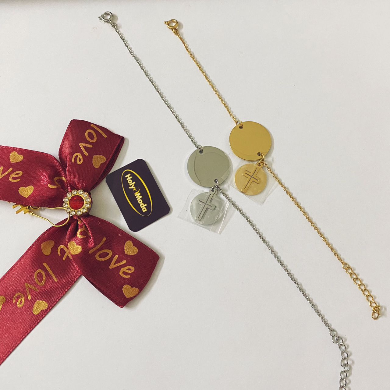BRACELET CERCLE CROIX PENDANT PLAQUE OR ET ACIER INOXYDABLE . DISPONIBLE EN TAZILLE 19CM ET 15CM.