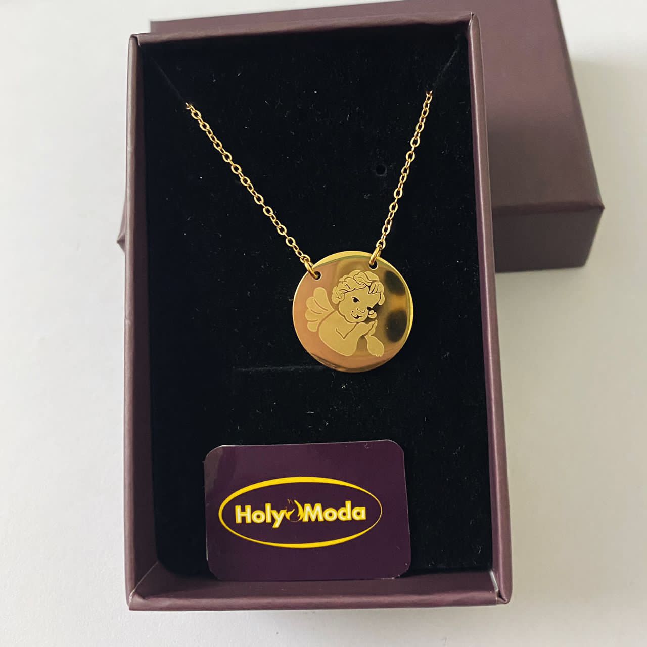 MEDAILLE RONDE AVEC IMAGE D’ANGE . DISPONIBLE EN PLAQUE OR ET ACIER INOXYDABLE.