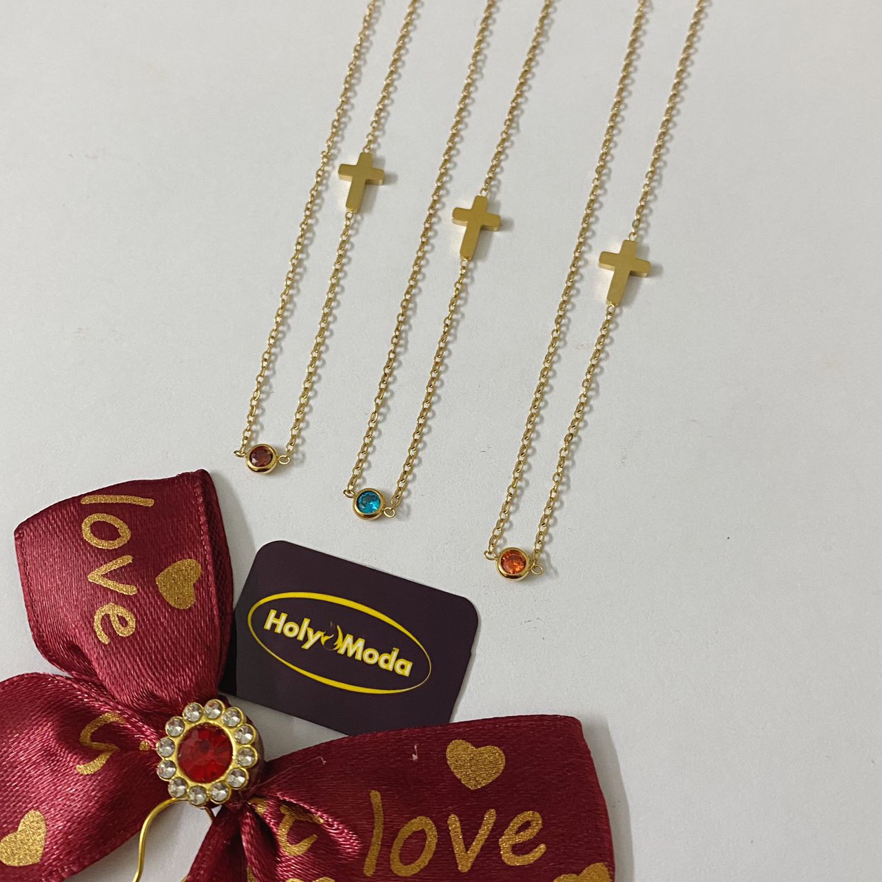 chaine croix avec pierre rouge ; bleu et vert avec plquage or . longeur 38cm+5cm. magnifique bijou dame