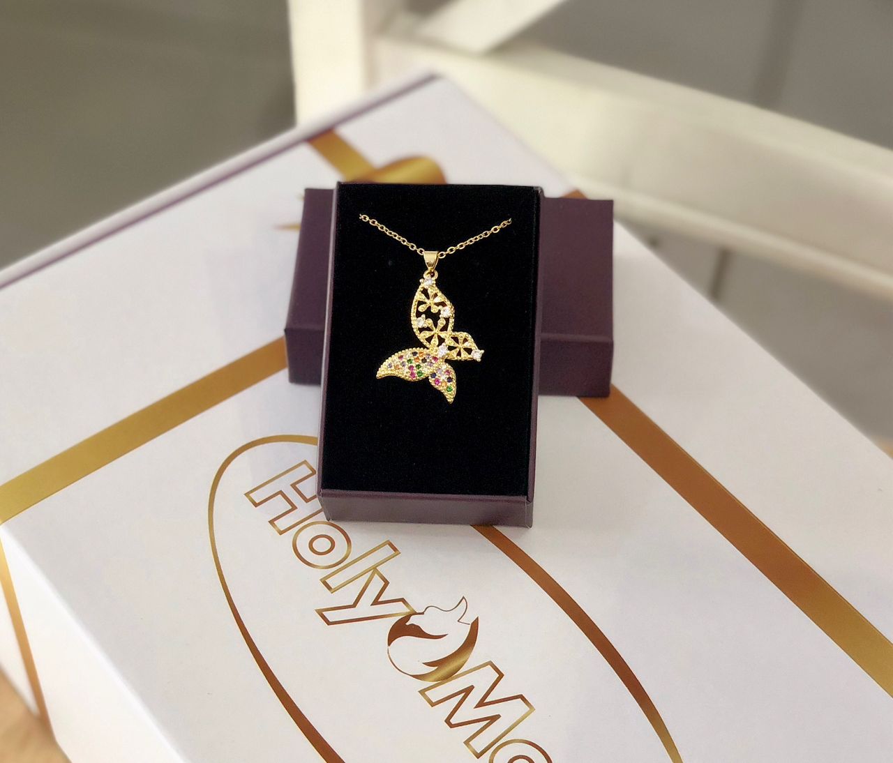 CHAINE PAPILLON 02 PLAQUE OR POUR DAME AVEC STRASS MULTICOLORE
